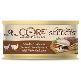 Куриный бульон, курица 34%, крахмал тапиоки, картофельный крахмал, куриная печень 2,4%, яйца, индейка 1,4%, подсолнечное масло, минералы
