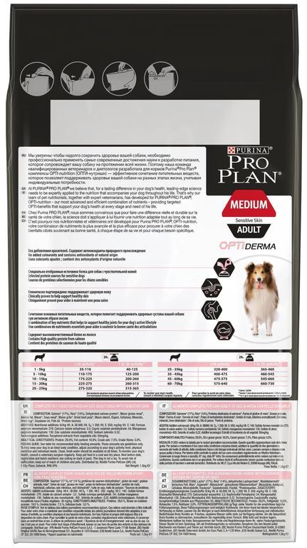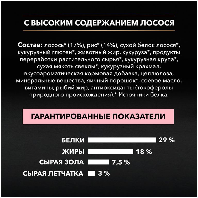 лосось (17%), рис (14%), кукуруза, сухой белок лосось, кукурузный глютен, кукурузная крупа, продукты переработки растительного сырья, животный жир, вкусоароматическая кормовая добавка, сухая мякоть свеклы, яичный порошок, кукурузный крахмал, минеральные вещества, целлюлоза, рыбий жир, сушеный корень цикория, соевое масло, витамины, антиоксиданты