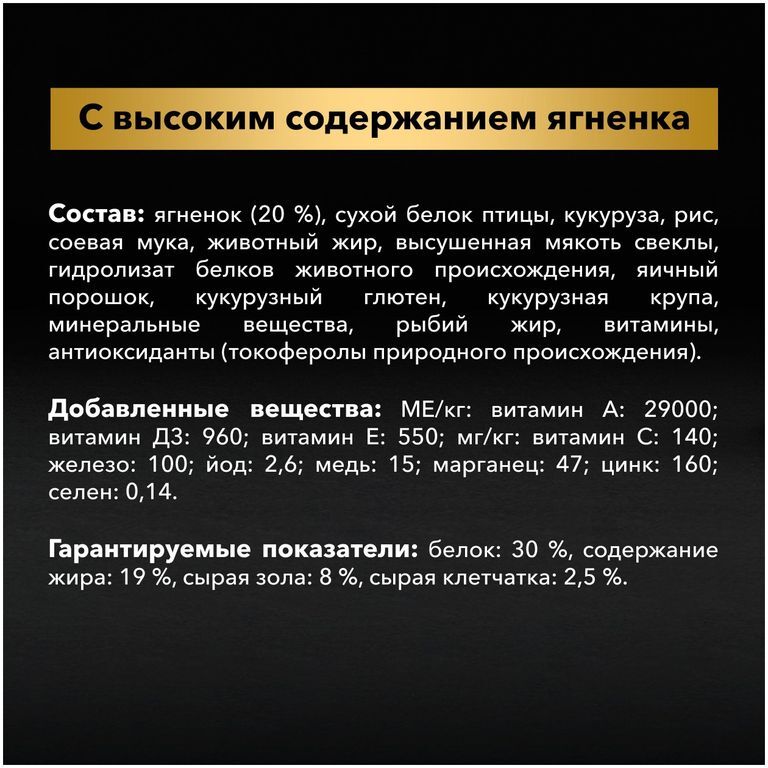 Ягненок (20%), сухой белок птицы, кукуруза, рис (10%), продукты переработки растительного сырья, животный жир, сухая мякоть свеклы, вкусоароматическая кормовая добавка, яичный порошок, кукурузный глютен, кукурузная крупа, минеральные вещества, рыбий жир, витамины, молозиво (0,1%), антиоксиданты (токоферолы природного происхождения).